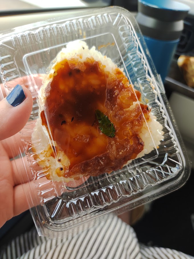 おむすびは涼しい車内で食べることにしました(^^♪ こちらは中華風おこわ。濃すぎず程よい味付けでパクパクいける!
